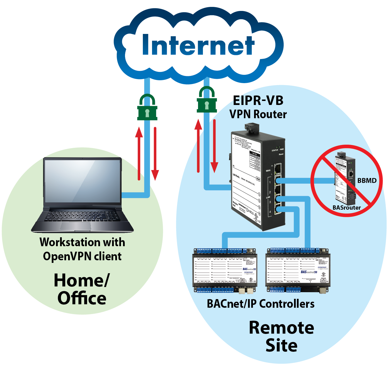 BridgeVPN allows users to set up and maintain secure access to a remote site without subscription fees or the need for a cloud-based VPN server. Contemporary Controls' EIGR-VB Gigabit IP router can be configured as a VPN server with Layer 2 bridge mode that allows passage of multicast and broadcast messages which eliminates the need for a BACnet/IP Broadcast Management Device (BBMD).