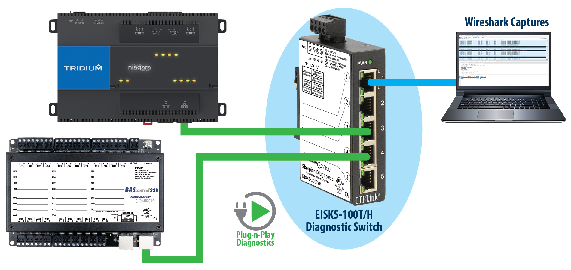 Designed for the demanding requirements of an industrial automation environment, the Skorpion Diagnostic Switch can be permanently installed or replaced with an unmanaged switch once the system is commissioned. This device can also be useful when developing embedded Ethernet devices because you can connect the Skorpion Diagnostic Switch between two embedded Ethernet devices and view their messages using Wireshark.