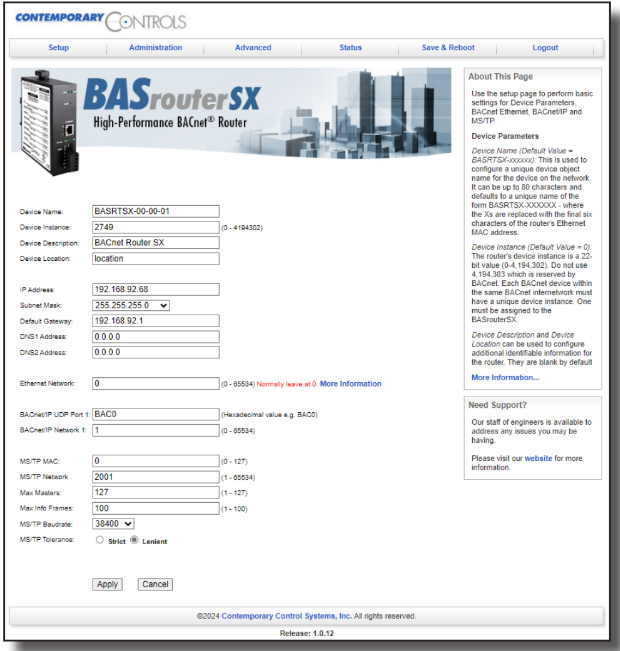 An MS/TP Status webpage features a graphical table that provides real-time status of all BACnet MS/TP devices on the network. As a BACnet/IP Broadcast Management Device (BBMD), up to 50 BDT and 147 Foreign Device Registration (FDR) entries can be supported. The BASrouterSX has two physical communication ports—a 10/100 Mbps BACnet/IP Ethernet port and an optically-isolated EIA-485 port for MS/TP. Router configuration is accomplished via web pages using HTTPS (HTTP over SSL) that provides encrypted webpage communications with the BASrouterSX.