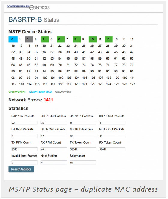 The Status webpage (see image below) can be helpful in analyzing the MS/TP network segment where the BASrouter is connected. The Status screen is always operational and keeps tabs on activity. It consists of an MS/TP Device Status table with color-coded blocks for each device, Network Errors count (in red), and router traffic Statistics. The Status page will automatically refresh every 5 seconds with the updated status on networks and devices — so you can observe the network state changes and gain insight into the condition of the BACnet network (as seen by the BASrouter). These statistics are retained over time, unless the BASrouter is powered off or rebooted from the main web page using the Save Changes button, then all Status page parameters are reset.