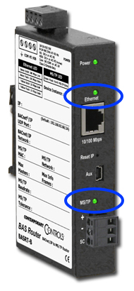 The most basic, and really the first step to troubleshooting your BACnet network using the BASrouter is to look at the Ethernet and MS/TP Receive LED lights on the front of the device. These lights are a good indicator of network activity. A bicolor Ethernet LED glows green for 100 Mbps, and yellow for 10 Mbps, and indicates activity by flashing. The MS/TP Receive green LED flashes rapidly when valid MS/TP traffic is received. When flashing continuously and without interruptions, the LED is a good indicator that the MS/TP network is operational. If there are long interruptions in the MS/TP Receive LED, you may have some issues on the MS/TP segment. The BASrouter has a resident web server which allows for commissioning and troubleshooting using a standard web browser. Use the Status page to troubleshoot the segment further.