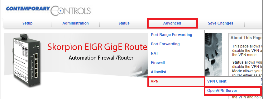 Contemporary Controls has application notes that explain how to configure an EIGR-V and EIGR-VB Gigabit IP router as an OpenVPN server. The entire VPN setup can be easily done via the built-in webpages. For access the application notes, visit the Skorpion Gigabit IP Router product page.
