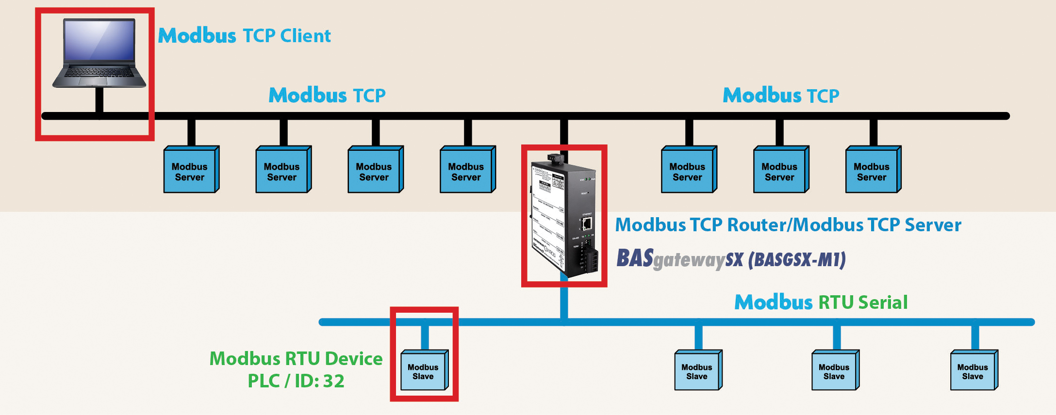 The BASgatewaySX (BASGSX-M1) provides gateway functionality between Modbus Serial (RTU or ASCII) and BACnet/IP and between Modbus TCP and BACnet/IP. This functionality is primarily used to integrate Modbus devices with a building management system (BMS). However, if communication between Modbus Serial and Modbus TCP devices is needed, the BASgatewaySX can simultaneously function as a Modbus Serial to Modbus TCP router.